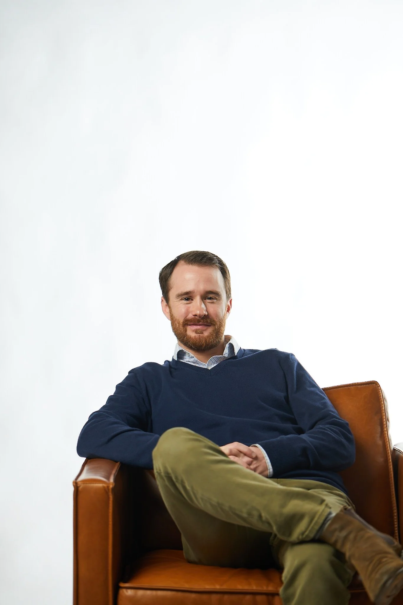 A man with a beard wearing a navy blue sweater and khaki pants, sitting in a brown leather chair against a plain white background.